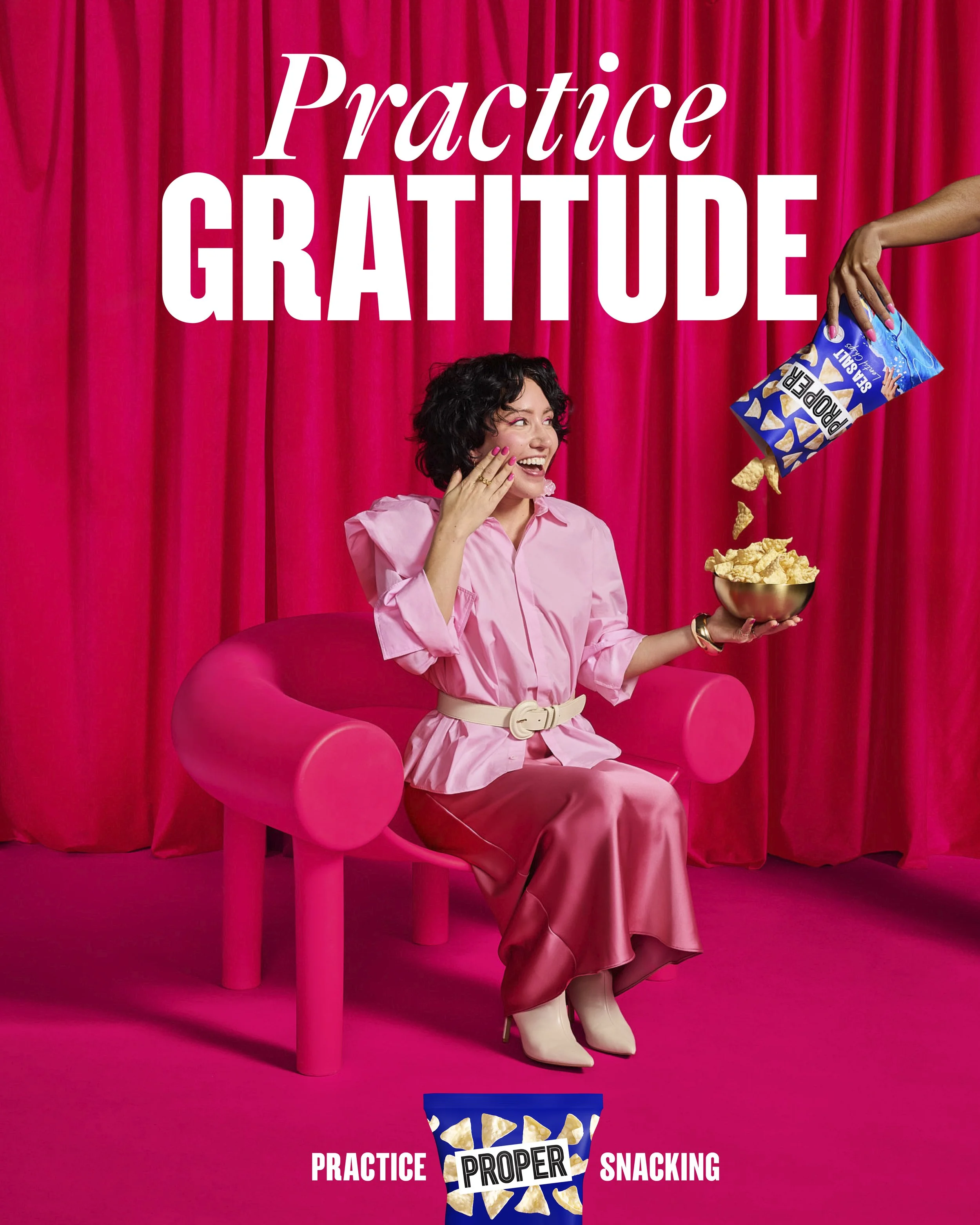 PROPER SNACKS ARE ON A MISSION TO REINVENT SNACKING AS A JOYFUL ACT OF WELL-BEING. the brand’s first 360 campaign, practice proper snacking pokes fun at the world of wellness by subverting acts of self-optimisation - kicking off nationally with ooh and social. i worked with the joyful and triumphant billy faithfull and kirsty ferris in collaboration with the brand’s in-house creative director becky akers to bring the brand platform to life. Photography by Jessica Pettway.